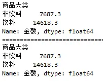 上述代码表示计算不同大类商品中不同二级类对应的总金额。结果如下: