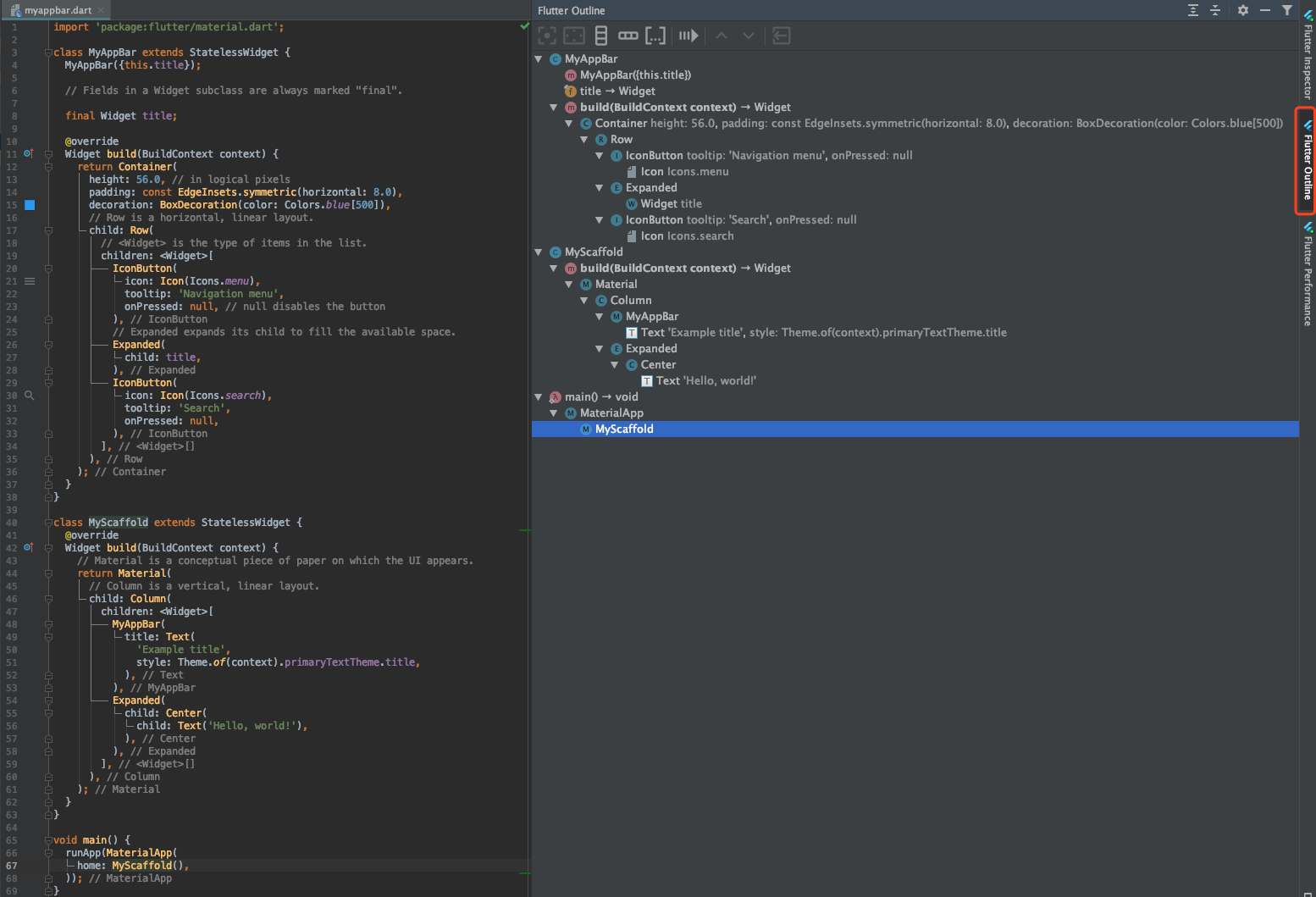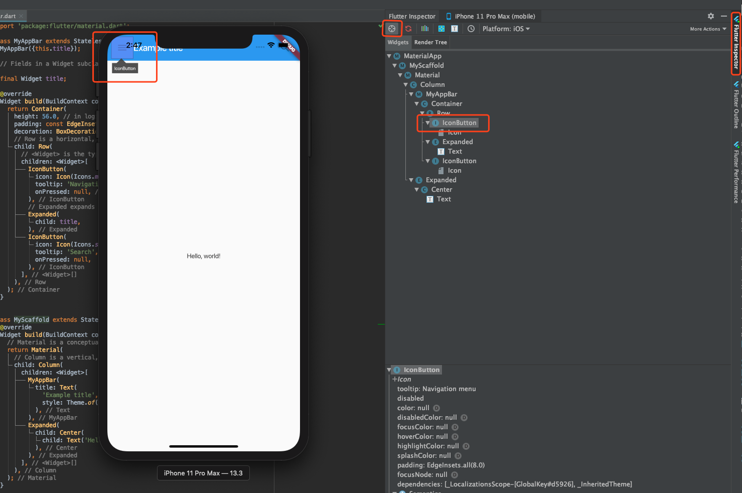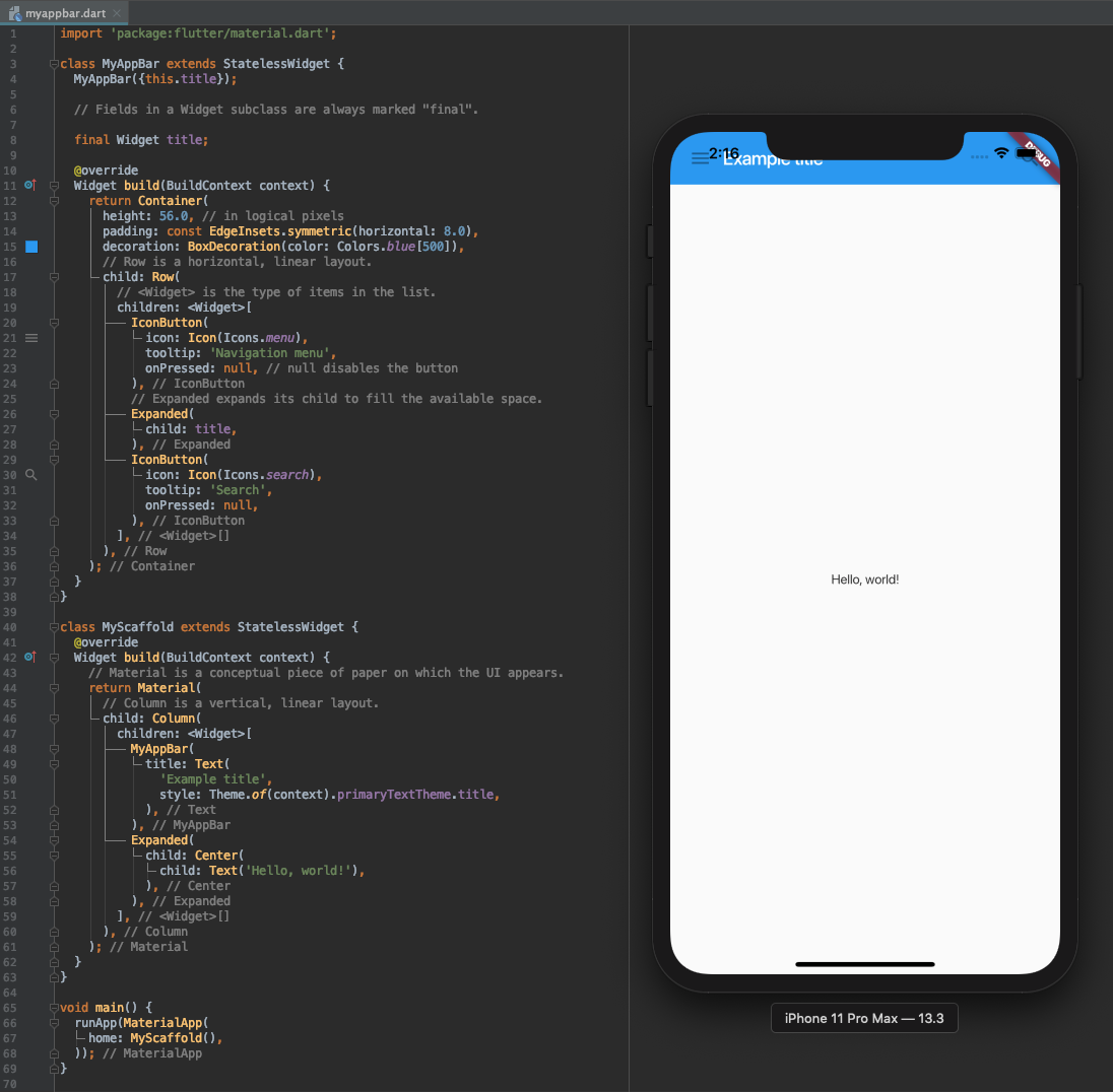 很容易观察到上图的MyAppBar空间区域跟手机设备的状态栏重叠在一起了,并没有自适应布局。我们将从MyAppBar和MyScaffold 切换到material.dart的AppBar和Scaffold Widgets,可以看到手机设备状态栏布局很好地进行了适配: