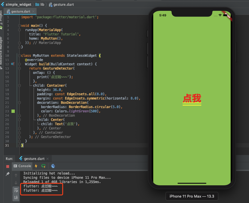 GestureDetector Widget能识别用户的手势,当监测到用户点击事件时,GestureDetector会调用其onTap()回调函数,如下图示例: