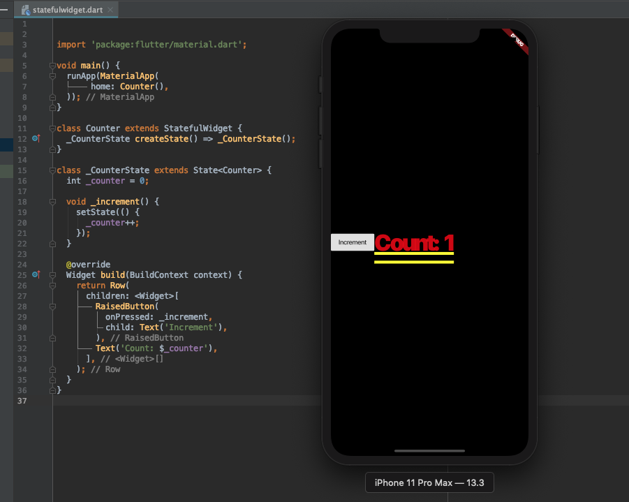 StatefulWidget提供更多的用户交互支持。其中Widget是临时对象,用于构造应用当前状态的展示。而 State对象在调用build()之间是持久的,以此来存储信息。下面是一个简单的示例: