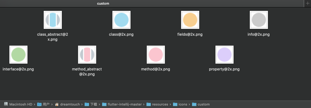 可以看到Flutter Inspector和Flutter Outline有不同的图标的显示,不同颜色和形状代表不同类型的信息,可以从下图对应的文件名大致可以理解一二,供大家参考。