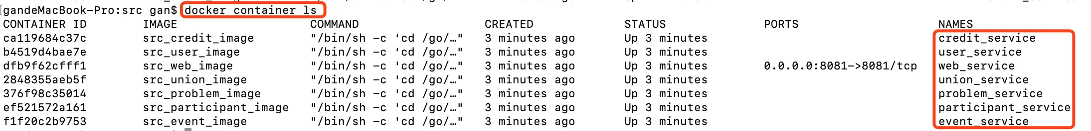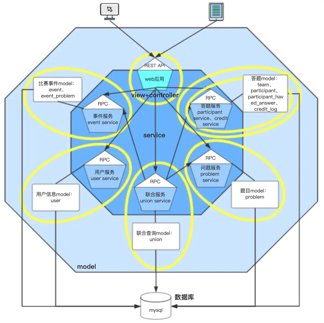 最终我们的系统架构图如下,其中每个圆圈就是一个独立的docker容器,结合docker-compose进行服务编排,实现一键启动整个系统。最终会有web应用、event service、user service、union service、problem service、participant service、credit service,7个容器服务。答题模块会有两个服务,participant service和credit service。