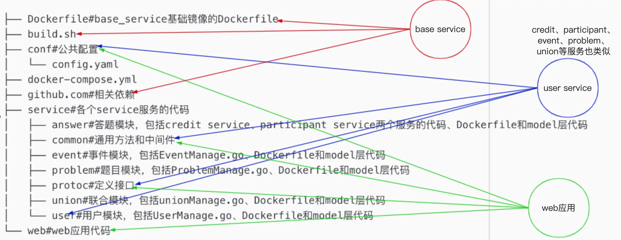 由于只有docker run -v的方式能指定挂载的宿主机中的目录,因此我们在Dockerfile中创建容器中存放代码的目录A,然后在运行镜像时使用docker run -v,将宿主机中存放代码的目录B和A关联起来。至于前端应用web应用,也是在创建容器时将宿主机中web的代码目录,与容器中beego的目录关联起来。而像conf(配置)、service/protoc(protoc定义)、service/common(公共方法)这些公共的内容,也要与每个容器相关联,最终目录结构与容器的关联关系如下。base service是基础镜像,其他镜像都从它继承。
