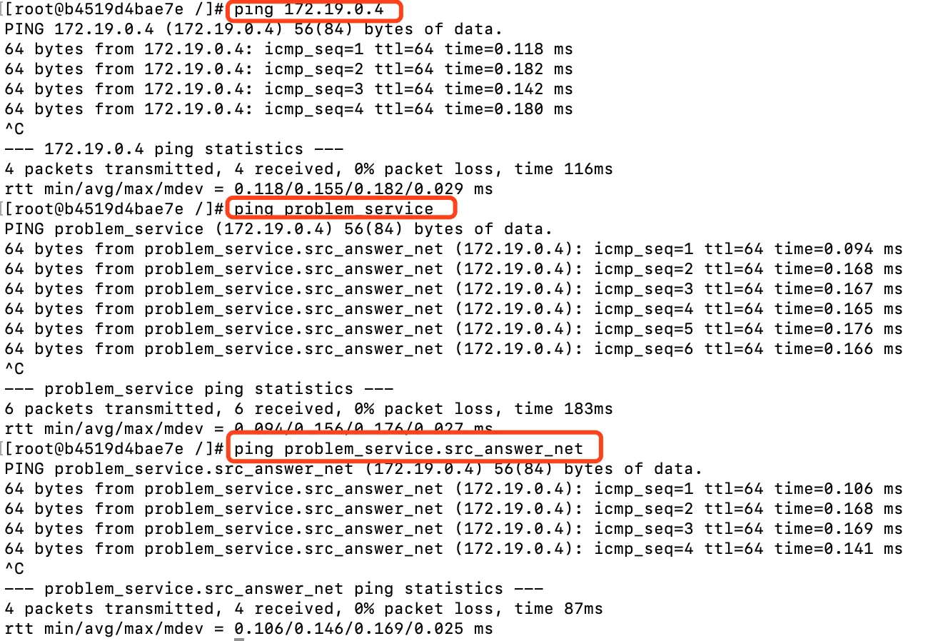 除了服务自身的信息,还有其他模块服务容器的IP地址,每个容器有两条,一条时容器的主机名+IP地址,另一条时将src_answer_net网络名作为域名后缀添加到主机名后。如果任何一个容器重启了,那么他的IP地址信息会自动在/etc/hosts中更新。