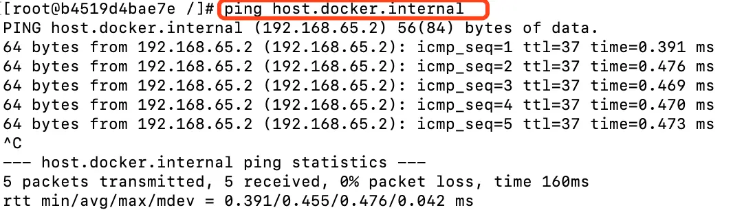docker容器和宿主机其实是通过docker0这个网桥进行通信的,所以要在docker容器中访问宿主机某个端口的应用,直接访问docker0的地址即可。在宿主机上执行ifconfig,会有docker0这个网桥信息。而在容器中,直接访问http://host.docker.internal:对应的端口即可。如在user的容器中 ping host.docker.internal成功,修改config.yaml中consul、mysql配置的地址为host.docker.internal即可。