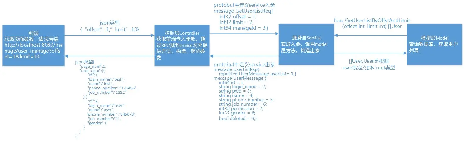 每个服务采用protobuf格式,定义好他能对外提供的服务接口、出参、入参。调用方在调用时,也使用protobuf格式编辑好传入该服务的参数。一个“获取系统用户列表”的例子如下: