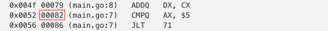 0x0047 00071 (main.go:7) MOVQ ""..autotmp_5+16(SP)(AX*8), DX0x004c 00076 (main.go:7) INCQ AX0x004f 00079 (main.go:8) ADDQ DX, CX