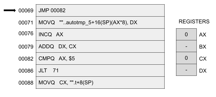 0x0041 00065 (main.go:4) XORL AX, AX0x0043 00067 (main.go:4) XORL CX, CX0x0045 00069 (main.go:7) JMP 820x0047 00071 (main.go:7) MOVQ ""..autotmp_5+16(SP)(AX*8), DX0x004c 00076 (main.go:7) INCQ AX0x004f 00079 (main.go:8) ADDQ DX, CX0x0052 00082 (main.go:7) CMPQ AX, $50x0056 00086 (main.go:7) JLT 710x0058 00088 (main.go:11) MOVQ CX, "".t+8(SP)