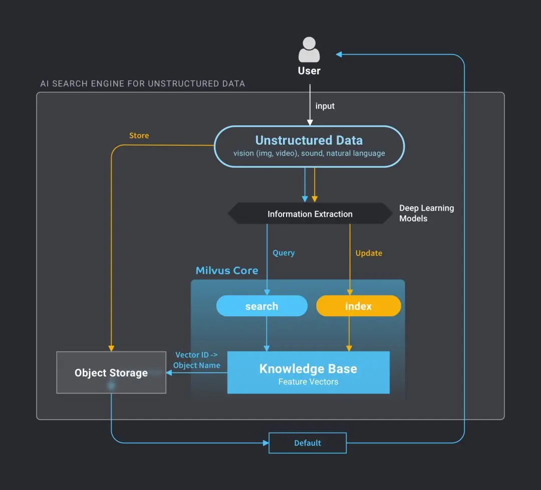 Milvus向量搜索引擎可以对接包括图片识别,视频处理,声音识别,自然语言处理等深度学习模型,为向量化后的非结构数据提供搜索分析服务。