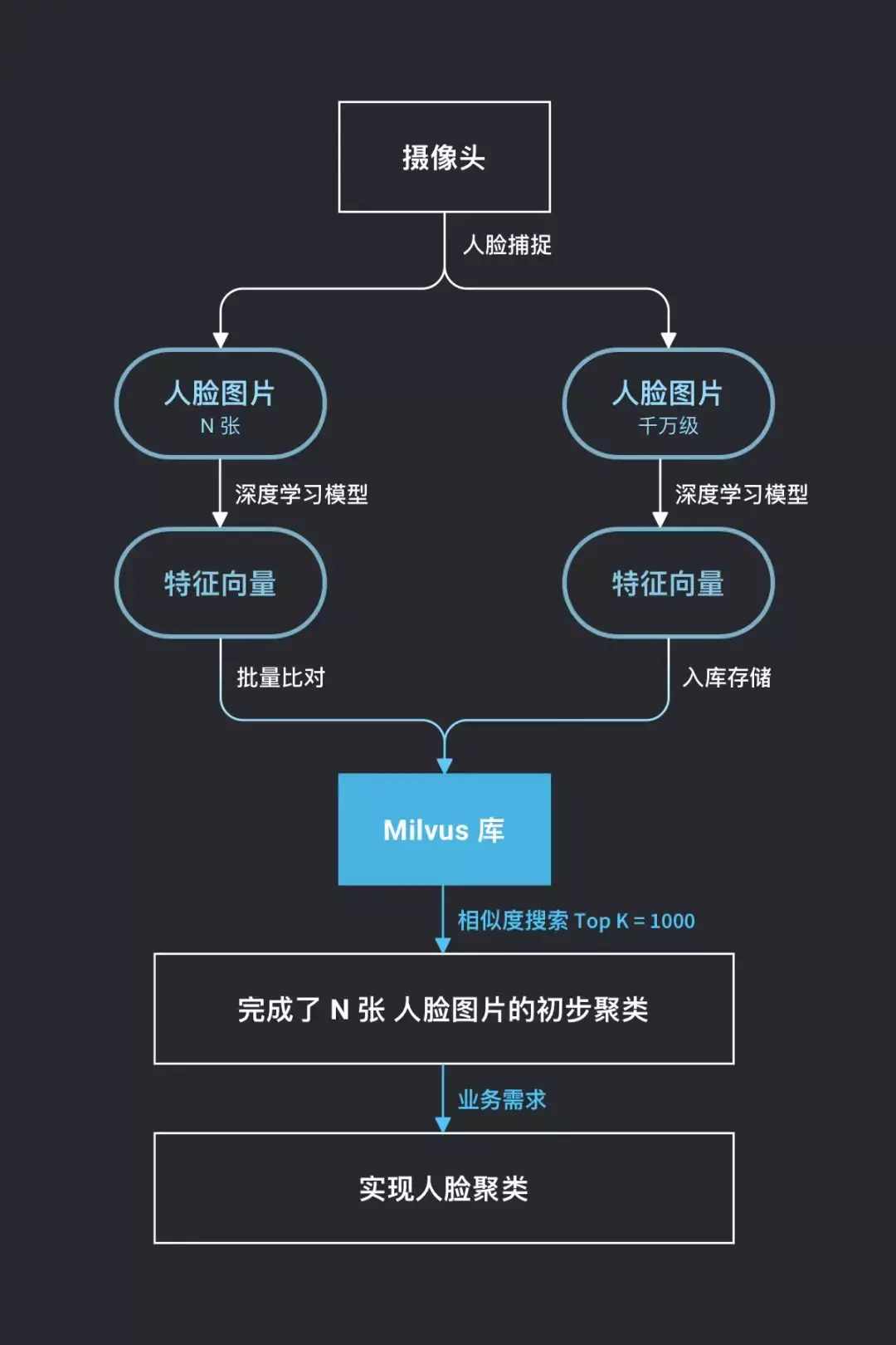 为了更加高效地完成人脸聚类,云从结合Milvus向量搜索引擎实现了大规模实时人脸聚类,基于动态数据建立一人一档。在其中一款产品的研发场景 中,首先将数千万张人脸图片提取为特征向量,再将转化好的数千万条向量导入Milvus的表中。然后通过Milvus批量搜索功能,对给定的一个批量(N张)的人脸图片向量在导入好的底库中进行搜索,得到底库中分别与这数百张人脸图片相似度为Top-K个人脸,结果集为N*K张人脸,即完成了底库中对这N张人脸图片的初步聚类。