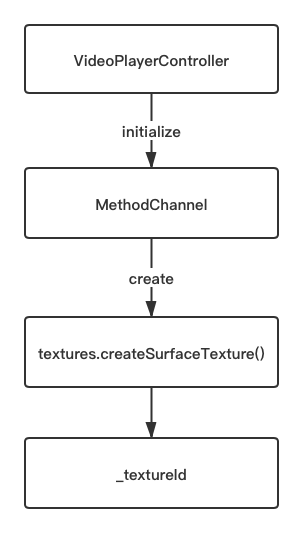 举个例子,在 Android 原生层中 video_player 使用的是 exoplayer 播放内核,那么如上图所示,VideoPlayerController 会在初始化的时候通过 MethodChannel 和原生端通信,之后准备好播放内核和 Surface,最后将对应的 textureId 返回到 Dart 中。