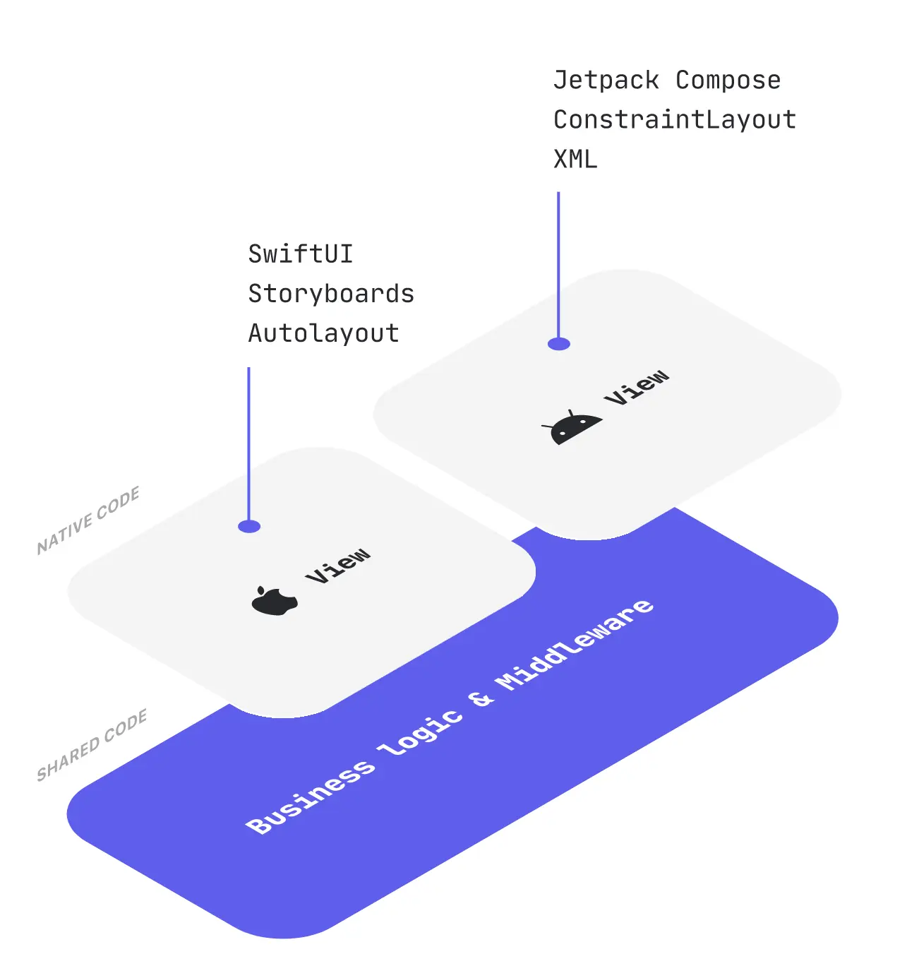 说到这里有人担心 Kotlin 这是不是在跟 Flutter 叫板。显然不是嘛,Kotlin 跨平台一直都声称自己只是为了逻辑代码的共享,UI 大家还是用原生的就好啦。于是乎 Android 原来该用 ConstraintLayout 你就用你的 XML 布局,iOS 呢就还是用你的 storyboard。