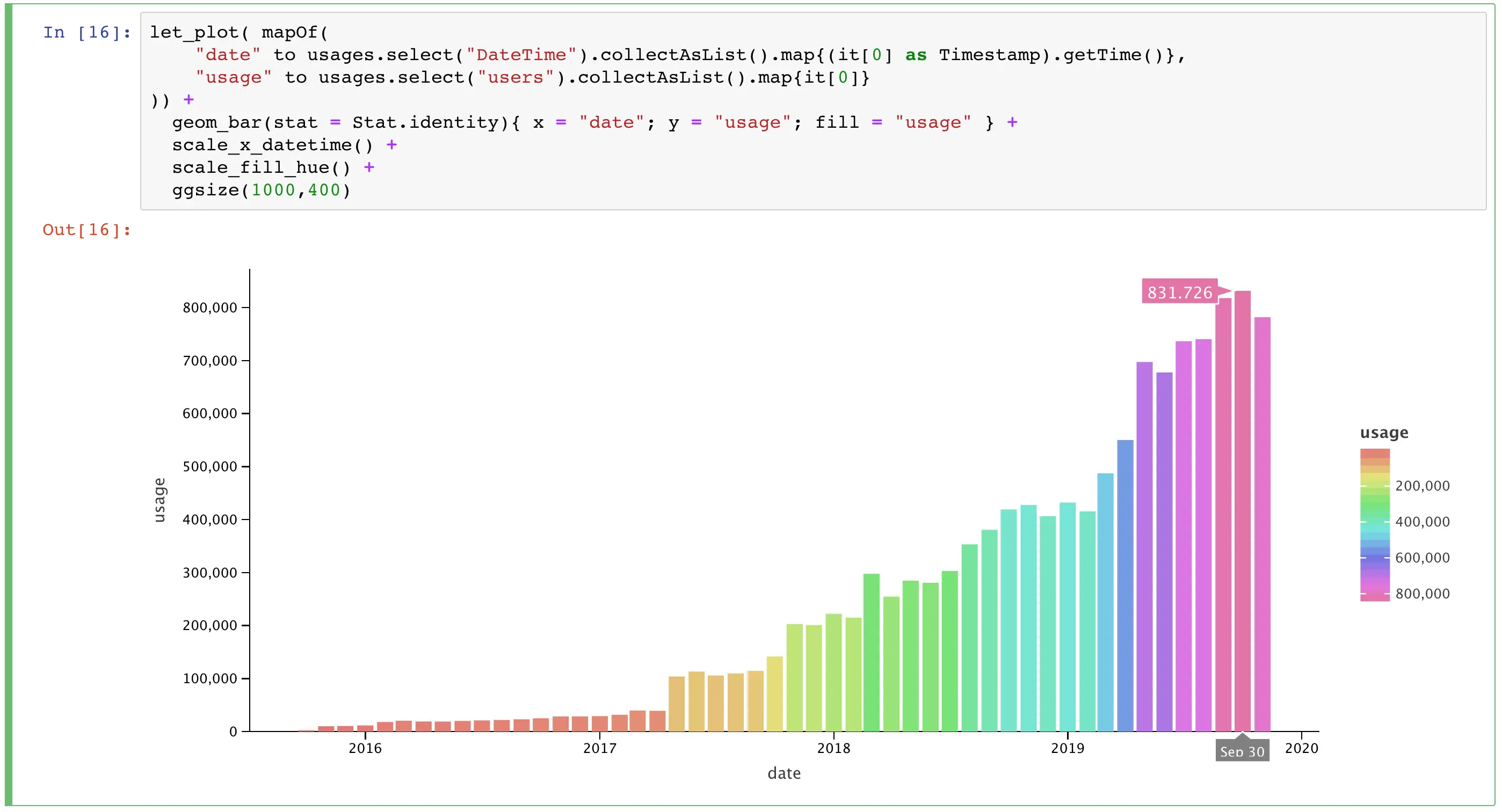忘了说了,现在已经有了 Jupyter 的 Kotlin 内核,所以以前在 Jupyter Notebook 里用 Python 写的代码也可以用 Kotlin 写了,贴一张官网的效果图: