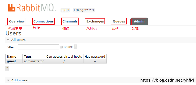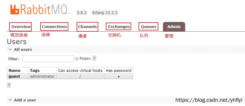 用户名和密码:guest和guest,输入登录之后就可以进入RabbitMQ管理页面。
