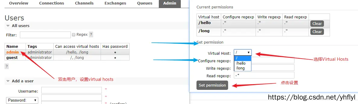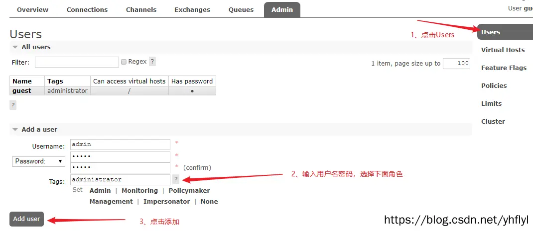 | 监控者 | monitoring | 可登陆管理控制台,同时可以查看rabbitmq节点的相关信息(进程数,内存使用情况,磁盘使用情况等) |