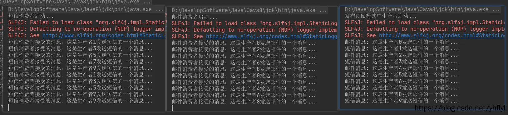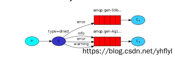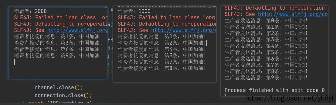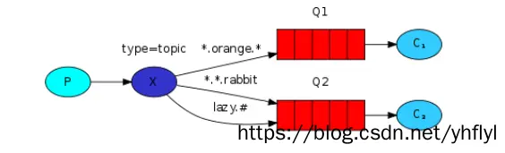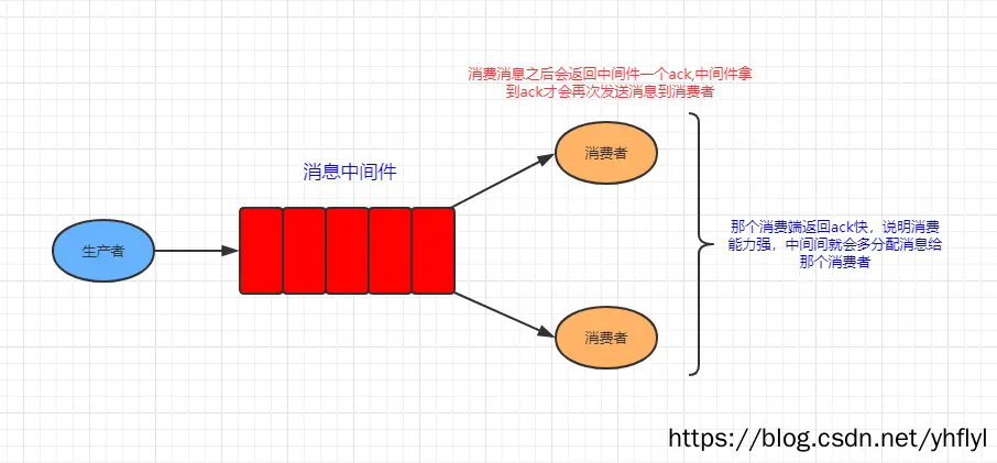 一个生产者P发送消息到队列Q,一个消费者C接收。有多个消费者会使用轮询方法进行消费队列中信息。