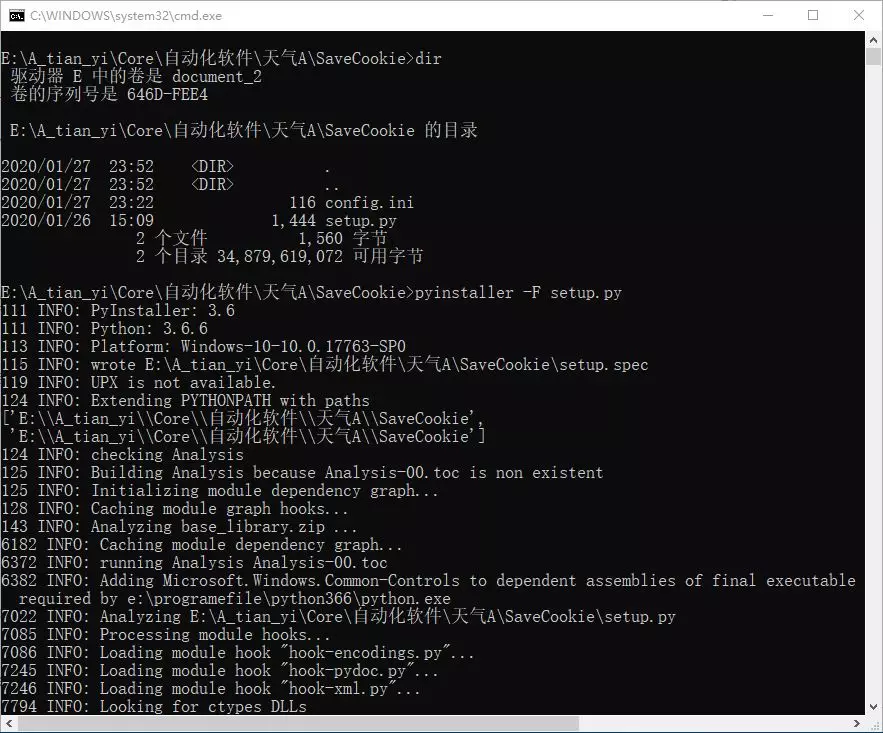1、我们来将这个.py的文件打包成一个exe,我们直接cmd切换到这个脚本的目录,执行命令:pyinstaller-F setup.py,如下图所示。
