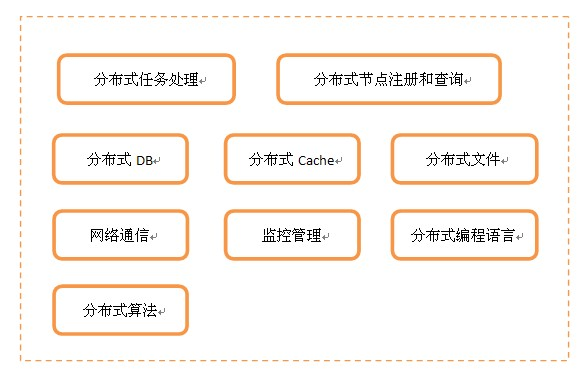 有些情况下,对分布式的需求就没这么简单,在每个环节上都有分布式的需求,比如Load Balance、DB、Cache和文件等等,并且当分布式节点之间有关联时,还得考虑之间的通讯,另外,节点非常多的时候,得有监控和管理来支撑。这样看起来,分布式是一个非常庞大的体系,只不过你可以根据具体需求进行适当地裁剪。按照最完备的分布式体系来看,可以由以下模块组成: