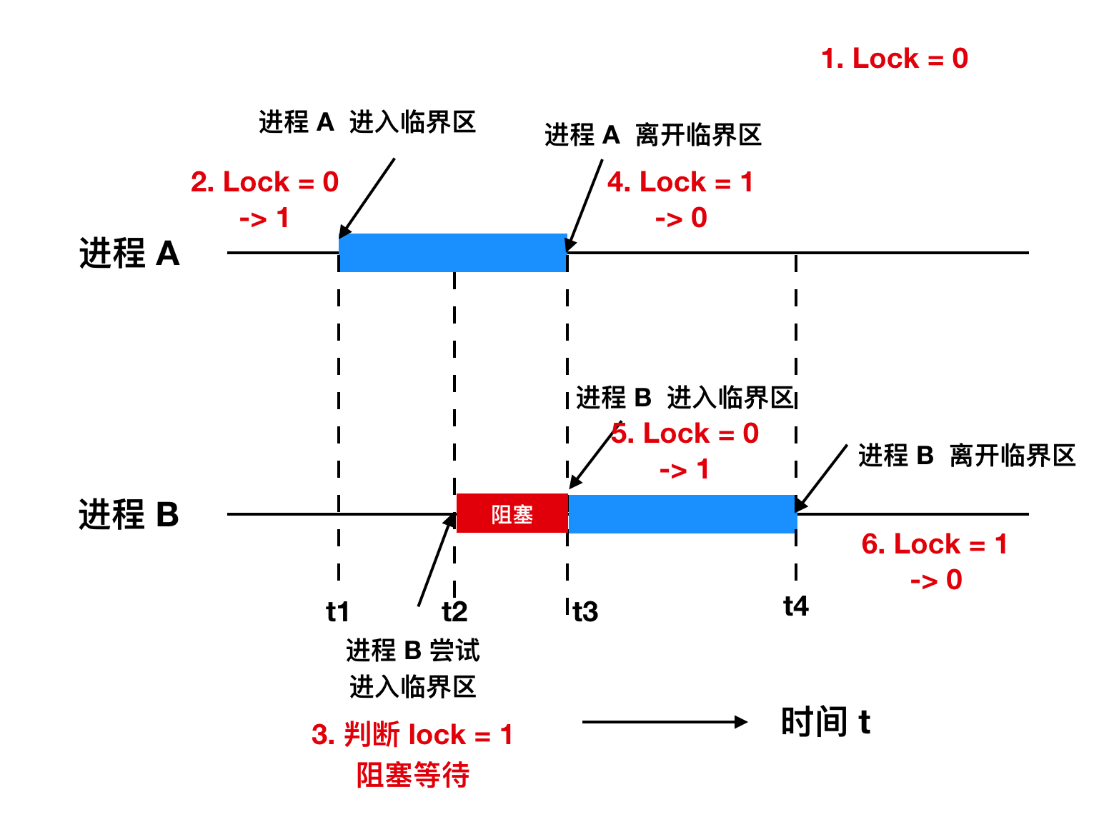 从抽象的角度来看,我们通常希望进程的行为如上图所示,在 t1 时刻,进程 A 进入临界区,在 t2 的时刻,进程 B 尝试进入临界区,因为此时进程 A 正在处于临界区中,所以进程 B 会阻塞直到 t3 时刻进程 A 离开临界区,此时进程 B 能够允许进入临界区。最后,在 t4 时刻,进程 B 离开临界区,系统恢复到没有进程的原始状态。