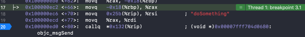 objc_msgSend函数来发送消息的,我们在objc_msgSend函数处打上断点,继续跟进去看看。