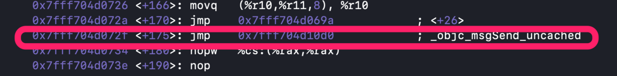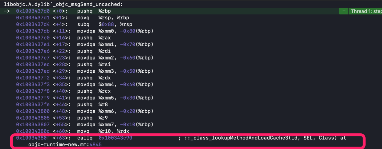 我们可以清楚的看到,objc_msgSend在缓存没有命中之后调用了_objc_msgSend_uncached。