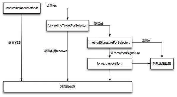 如果我们在这一步返回了一个对象去处理这个未处理的消息,那么消息转发的流程到这一步就完成了。接下来这个未处理的消息会在我们返回的对象中,进行消息的查找流程和异常的处理。