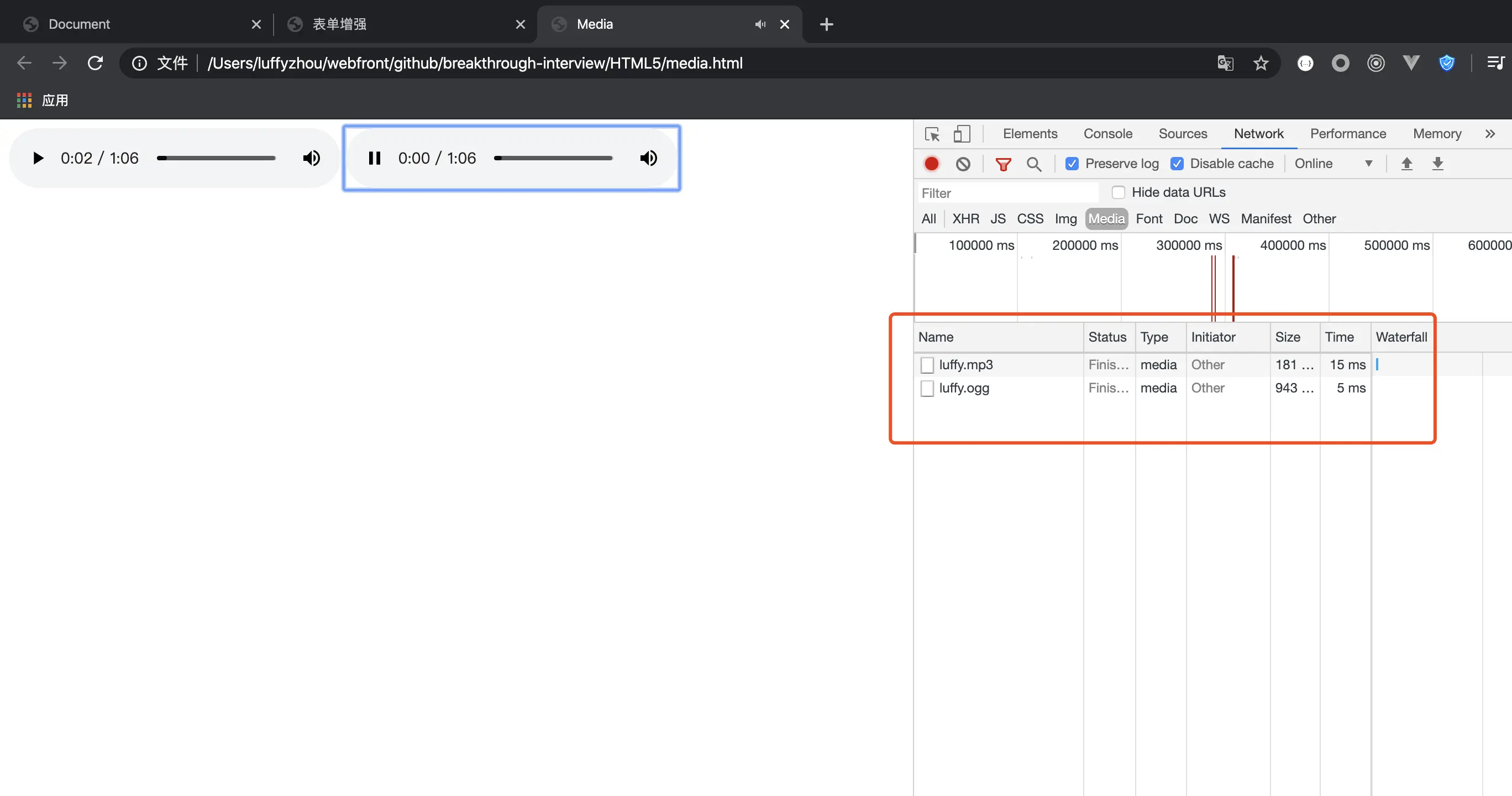 可以看到,第一个播放的是 mp3 文件,第二个播放的是 ogg 文件。