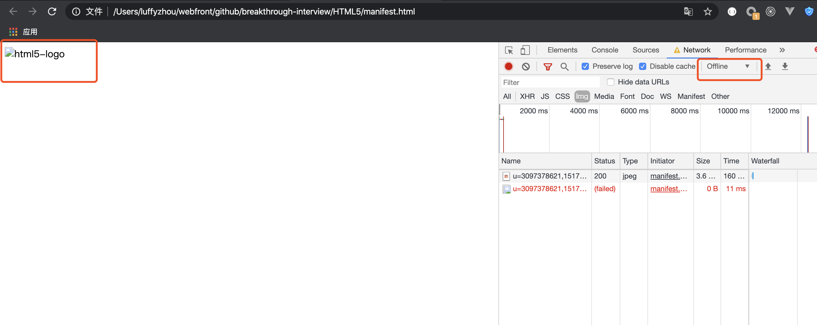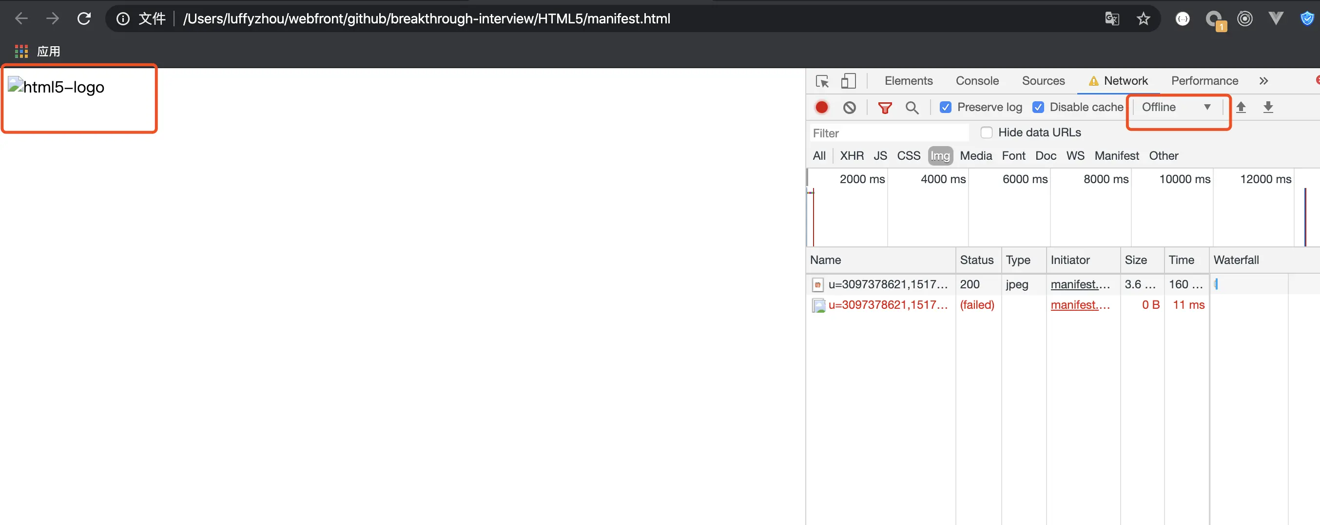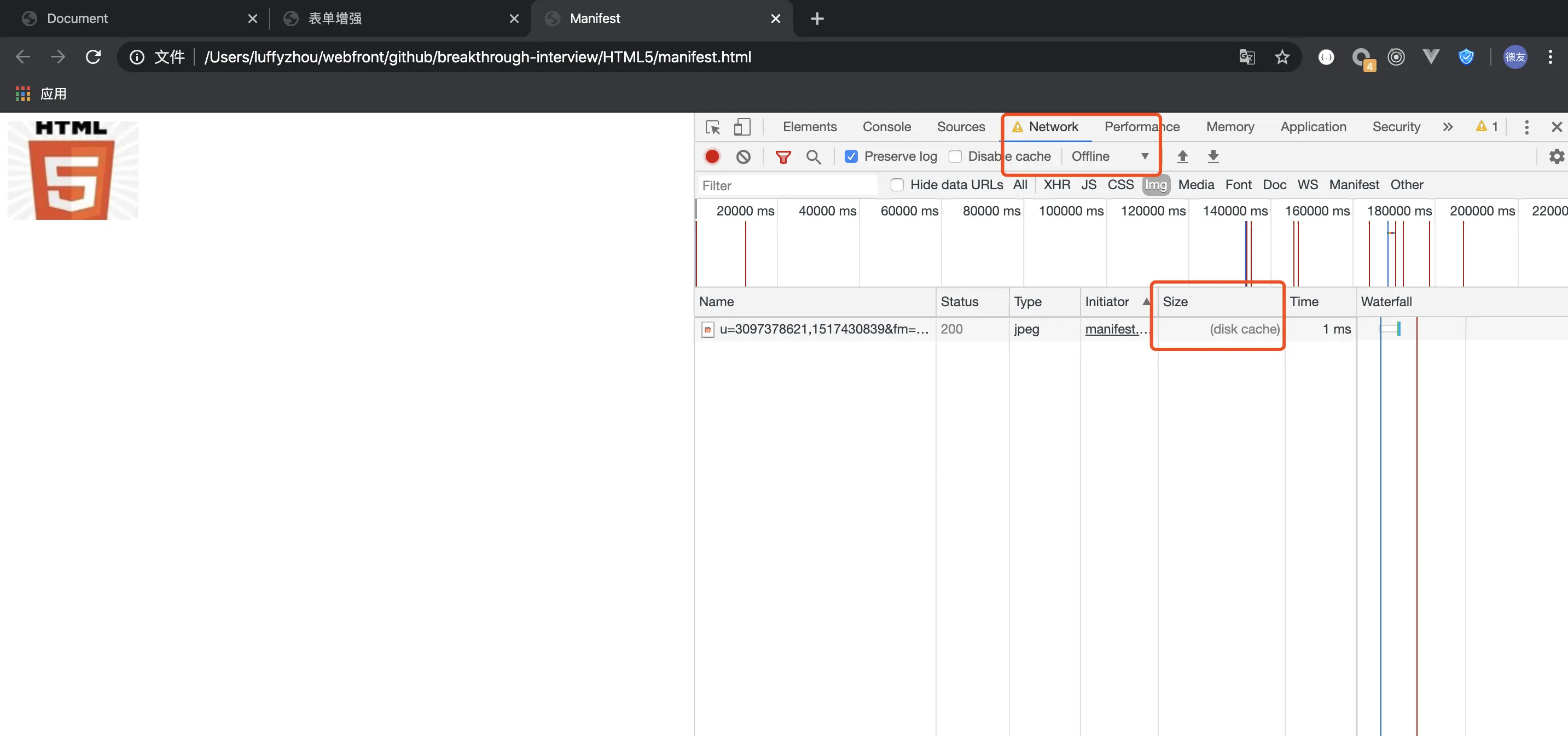 里面对应的内容就是我们希望缓存的图片线上地址,然后我们在有网的时候访问一下,再关闭网络,刷新页面就会发现图片可以正常展示,并且从图中可以看出,加载的图片就变成了从 cache 里获取。