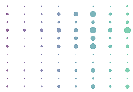 气泡图(bubble chart)是可用于展示三个变量之间的关系。它与散点图类似,绘制时将一个变量放在横轴,另一个变量放在纵轴,而第三个变量则用气泡的大小来表示。排列在工作表的列中的数据(第一列中列出 x 值,在相邻列中列出相应的 y 值和气泡大小的值)可以绘制在气泡图中。气泡图与散点图相似,不同之处在于:气泡图允许在图表中额外加入一个表示大小的变量进行对比。(摘自百度百科)