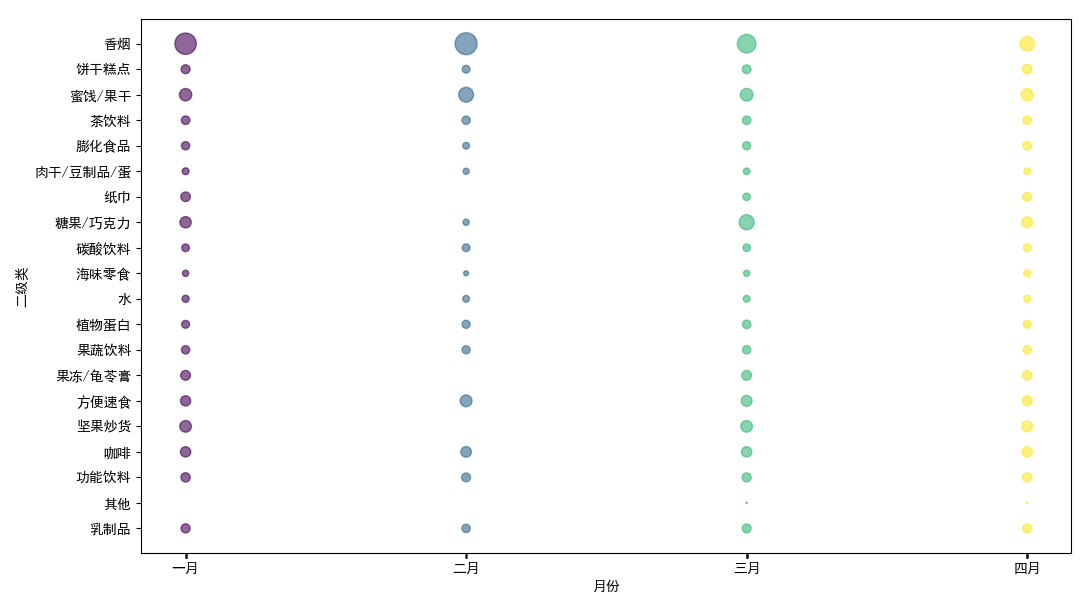针对数据提出要求:绘制每月交易额均值气泡图,横轴为时间,纵轴为商品的二级类目