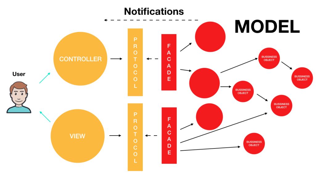 这些原则的核心是 Presentation 和 Domain Model 之间的强分离。MVC 中的模型表示整个域模型。UIViewController 是 Presentation 的一部分。这意味着 MVC 不允许我们创建一个哑实体并将所有业务逻辑移至 UIViewController。