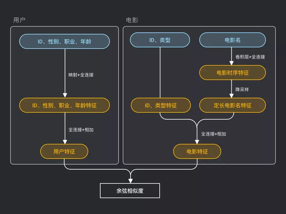 电影特征融合了三个属性信息,分别是电影 ID、电影类型 ID 和电影名称。