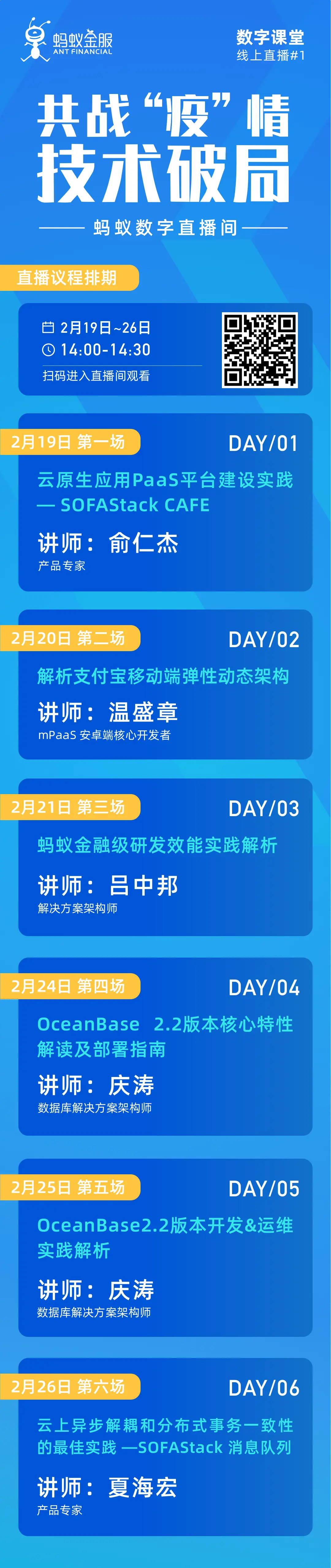 2月19日—2月26日 ,蚂蚁金服将开展“共战‘疫情’,技术破局”数字课堂线上直播。邀请资深专家从“云原生”、“研发效能”、“数据库”三方面分享蚂蚁金服的实践经验并在线答疑,解析PaaS在金融场景的落地建设实践,解析支付宝移动端弹性动态架构,分享OceanBase 2.2版本的特性和实践。
