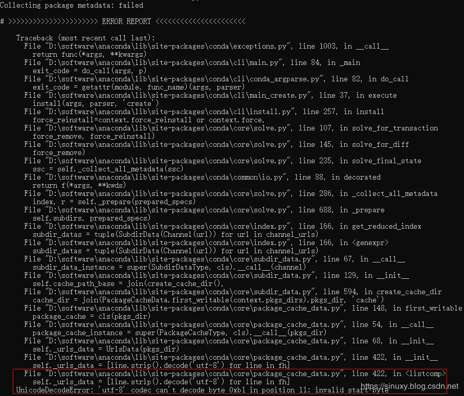 File "D:\software\anaconda\lib\site-packages\conda\core\package_cache_data.py", line 422, in <listcomp> self._urls_data = [line.strip().decode('utf-8') for line in fh] UnicodeDecodeError: 'utf-8' codec can't decode byte 0xb1 in position 11: invalid start byte