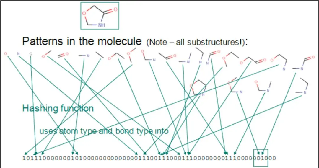 化学指纹通常用来做子结构检索和相似度检索,如下图所示,指纹是 (1/0) 位表示的有序列表,每一位代表化学结构中例如元素,原子对,官能团等的存在,如化合物C1C(=O)NCO1可以表示为: