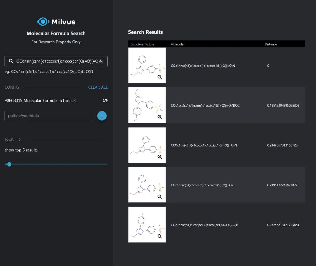 我们提供基于 Milvus 的化学结构检索 demo 展示 http://40.73.24.85 ,欢迎访问并检索您指定的 “种子” 化合物!