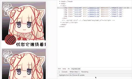 效果:初始化的时候已经有部分图片在可是区域内了,所以会直接显示需要加载的图片,当我们滑动页面时,注意看下图右侧元素菜单,发现后面2个img元素的src变动了。这就已经简单实现了我们的图片懒加载功能。