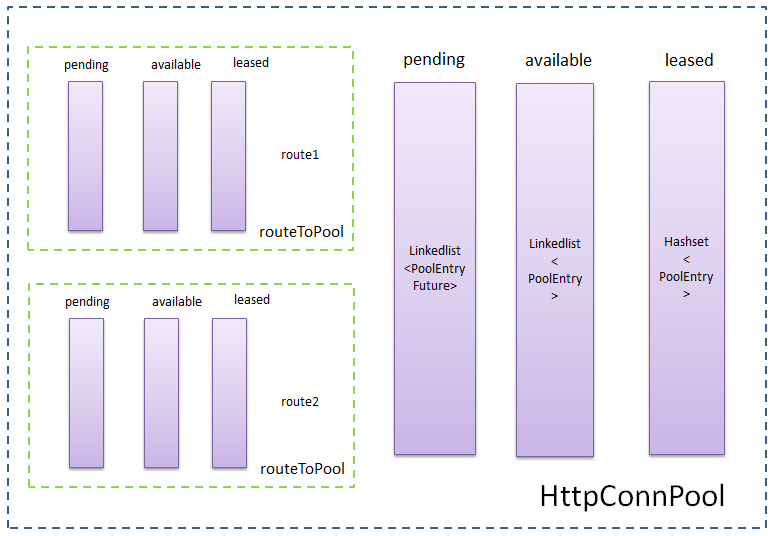 连接池管理器会为每个httpRoute单独的维护一个连接池。管理着available、leased、pending这些对象。同时,CPool本身也会维护一个总的available、leased、pending对象,是那些routeToPool中available、leased、pending的总和。这里介绍一下上图的几个概念