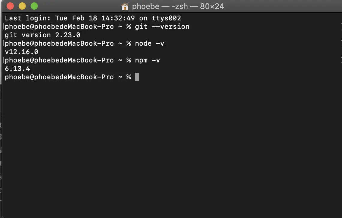 下好了之后打开Mac自带的命令面板,分别输入 git --version,node -v, npm -v