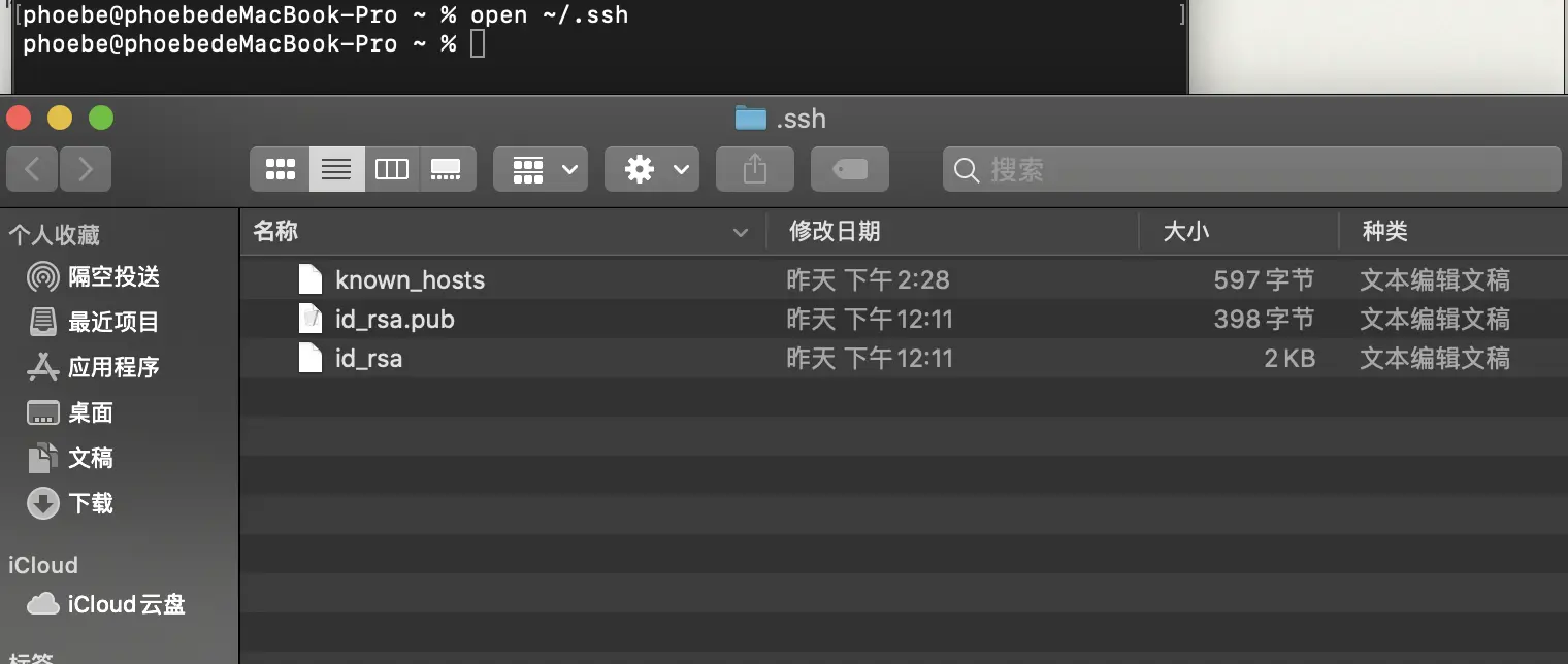 然后,查看电脑内是否有.ssh文件,查看方式如下(使用 open ~/.ssh命令),若不存在,则直接使用ssh-keygen -t rsa -C "邮箱名",来创建ssh文件;