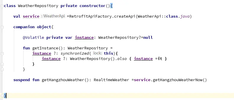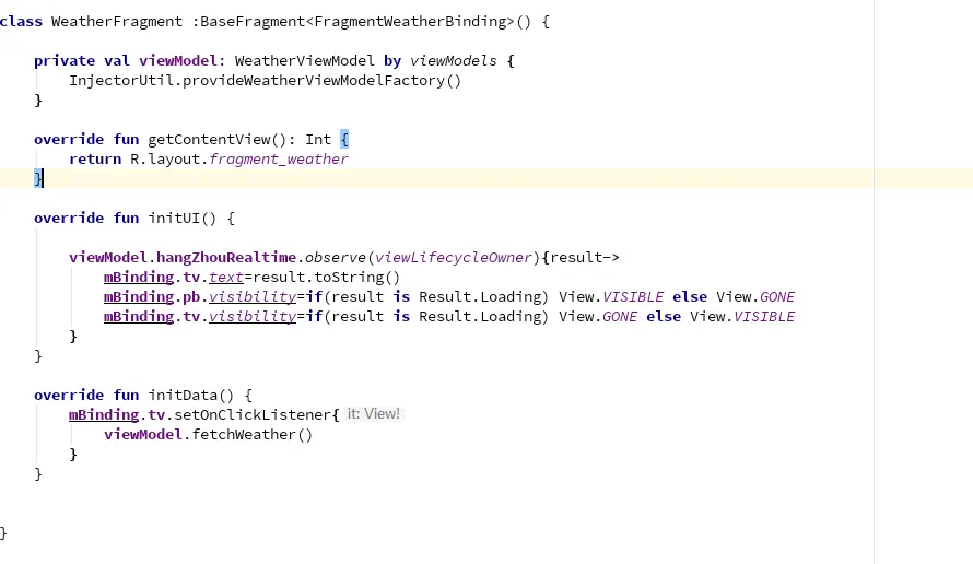 看里面有一个 getHangzhouWeather()方法用来获取网络数据。还有一个kotlin版本的单例写法,还有就是一个service变量由retrofit创建。等不及了我们赶紧发起一个网络请求,我们子在viewModel里面写一个方法: