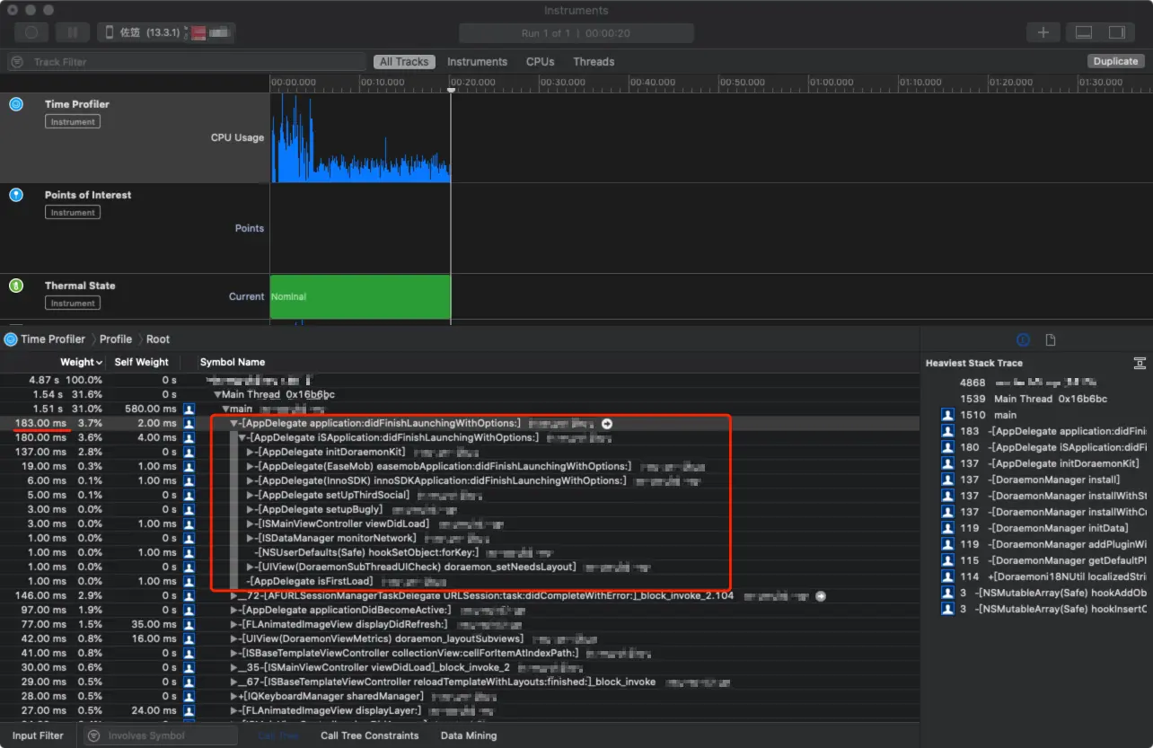 3、在初始化用时的248.89ms中,用时较多的几个初始化是libglInterpose.dylib、ibMainThreadChecker.dylib、InnotechShop、InnoAVKit等