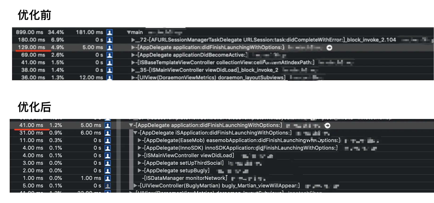 didFinishLaunchingWithOptions进行初始化的操作,延迟到首页渲染完成以后调用 - 友盟的分享服务,没有必要在启动的时候去初始化,初始化任务丢到异步线程解决,大概节省几百毫秒;