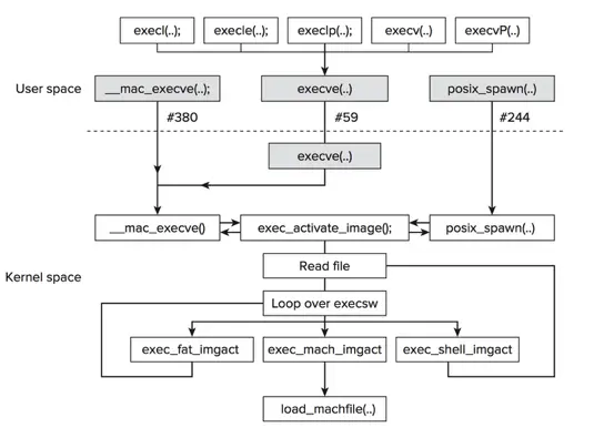 如图,当启动一个应用程序时,系统最后会根据你的行为调用两个函数,fork和execve。fork功能创建一个进程;execve功能加载和运行程序。这里有多个不同的功能,比如execl,execv和exect,每个功能提供了不同传参和环境变量的方法到程序中。在OSX中,每个这些其他的exec路径最终调用了内核路径execve。