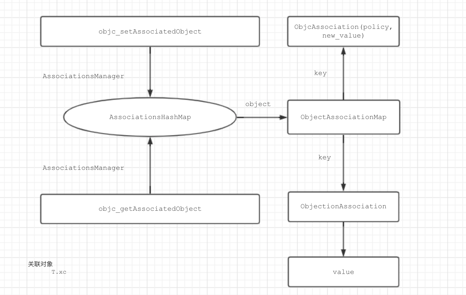 AssociationsManager: 关联对象的管理类AssociationsHashMap: 存储关联对象的HashMapObjectAssociationMap: 存储确定对象的表ObjecAssociation: 表中存储的最小结构,存储值和策略