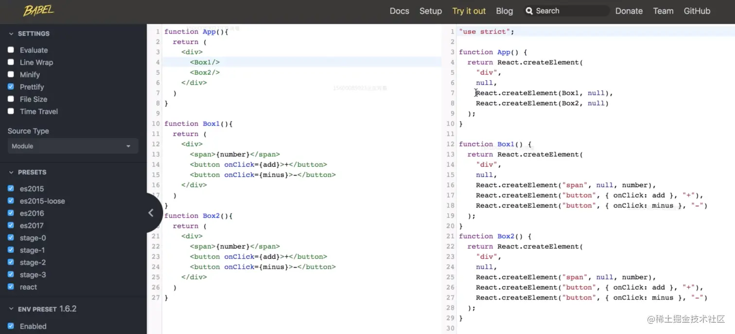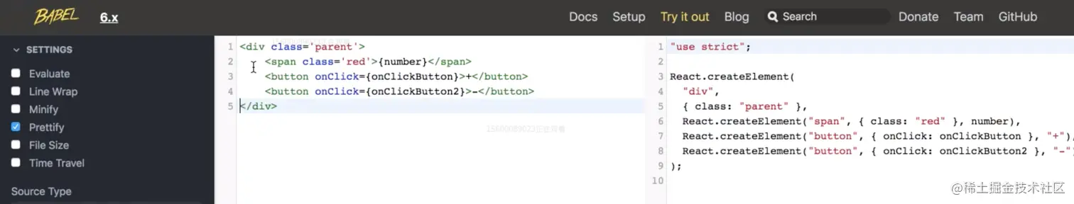 let div = React.createElement('div', {className: 'parent'}, span, button, button2);