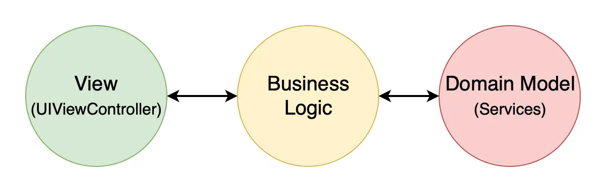 以该声明为公理,应用程序体系结构必须提供将 BL 与 UI 表示分离并使其可测试的功能。很明显,由于 UIViewController 子类对生命周期的依赖性,因此它不是该角色的最佳候选人。这意味着负责 BL 的类必须位于 UIViewController 和 Services 之间,或者换句话说,位于 View 和 Domain Model 之间。