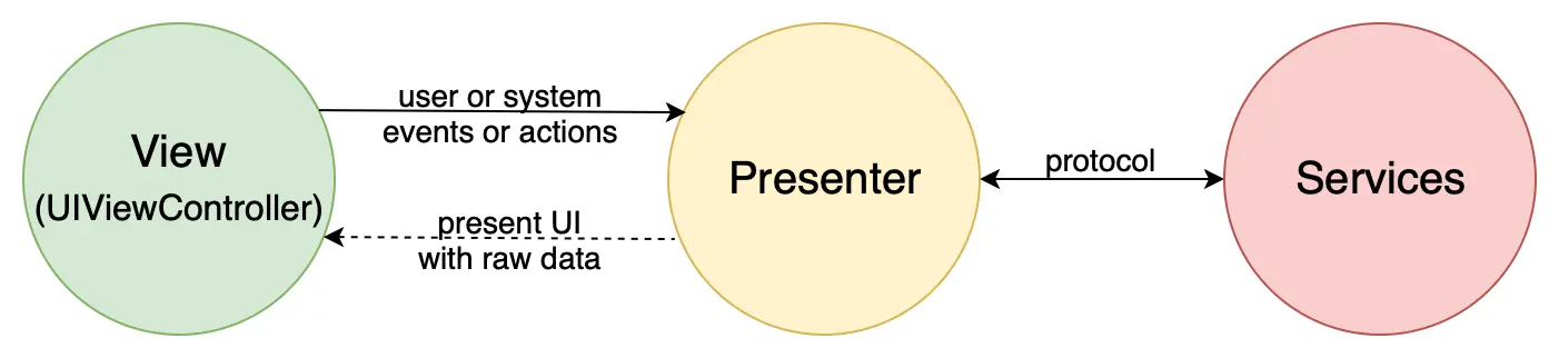 在 MVP 模式中,Presenter 和 View 通过协议相互链接。Presenter 被注入了 View 协议的实例,反之亦然,View 的协议必须具有足够的接口才能在 UI 中呈现原始数据,而Presenter 的协议必须具有传输从用户或系统接收到的事件(如触摸,手势,摇动等)的接口。UIViewController 子类在此处表示 View 部分,而 Presenter 类不能依赖UIKit(例如,有时需要导入 UIKit 才能对 UIImage 等数据类进行操作)。