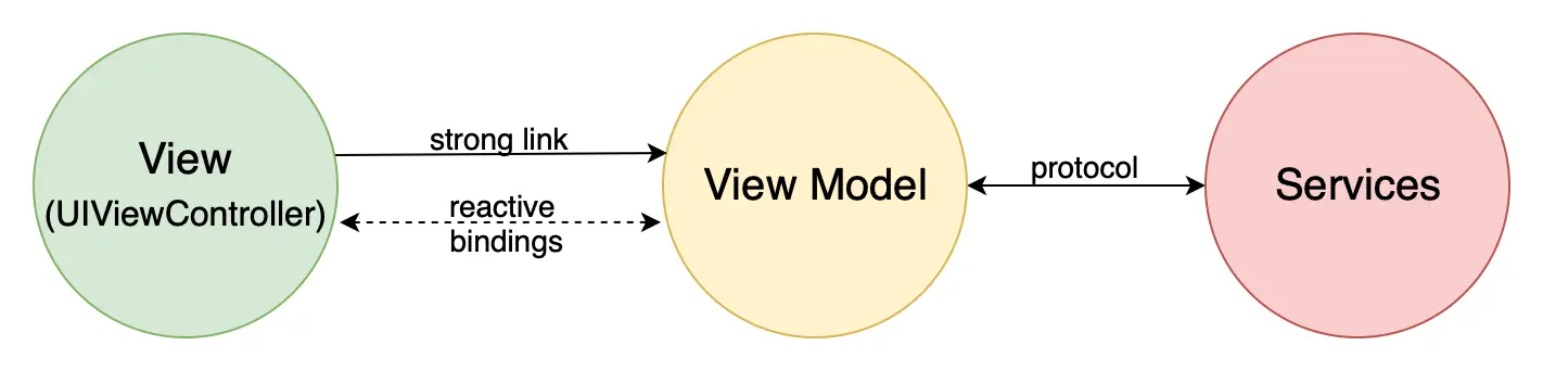 在 MVVM 模式中,表示和业务部分使用响应性绑定相互通信,它们分别称为 View 和 ViewModel。在 iOS 中,通常会使用 ReactiveCocoa,RxSwift 或现代的 Combine 框架进行响应性绑定,它们通常位于 ViewModel 类中,并且也由 ViewController 通过协议使用。在与 Services 或 Domain Model 进行通信的一部分中,MVP 并没有太大的区别,但人们可能更喜欢在这里使用绑定或响应性事件。与前面的模式一样,必须在协议中注入依赖项,以便在 UT 中模拟它们。