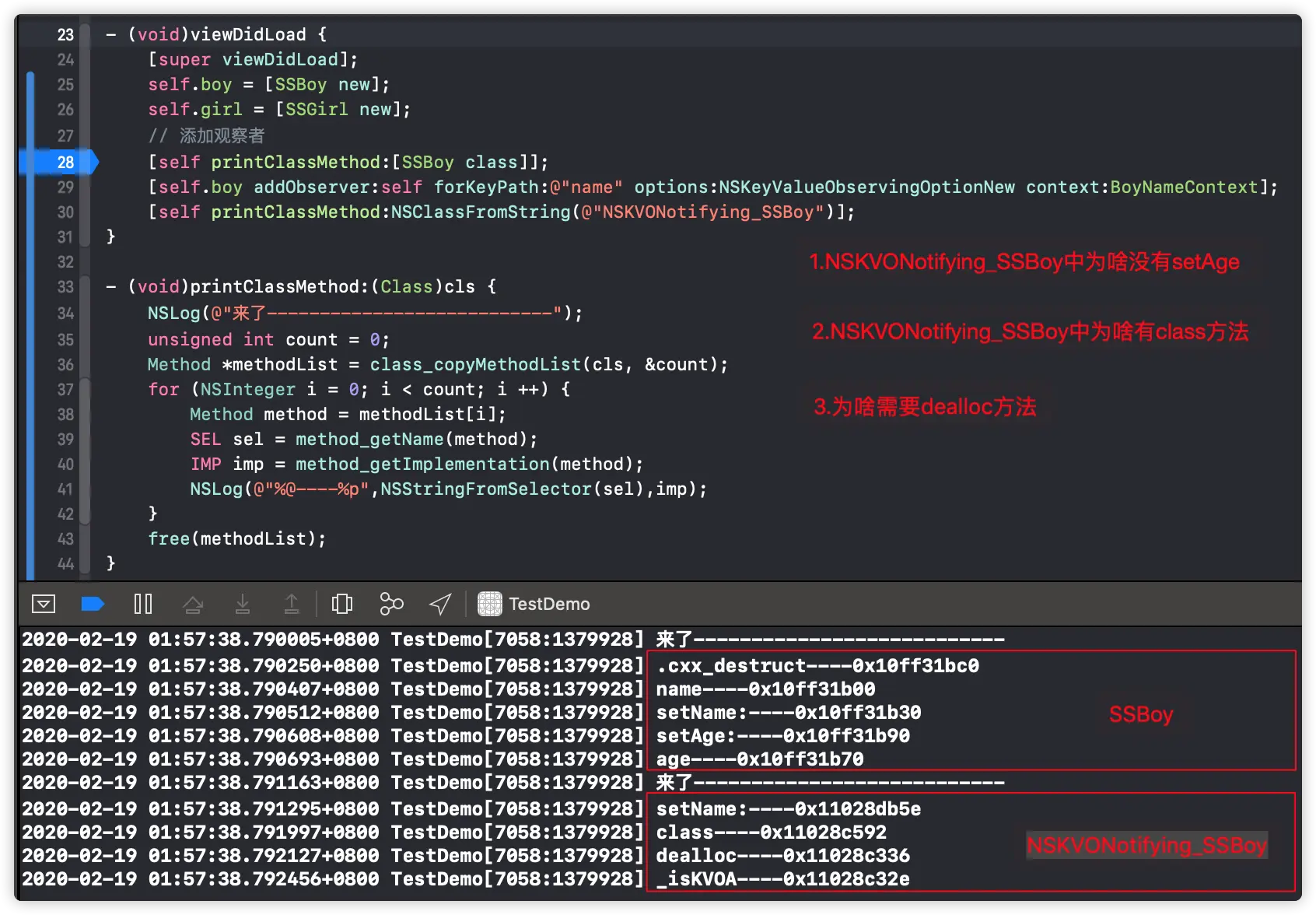 还是同样的代码,我们看到添加观察者之前,isa指向SSBoy,但是添加观察者之后就指向一个叫NSKVONotifying_SSBoy的类,这正好验证了上述文档所说。